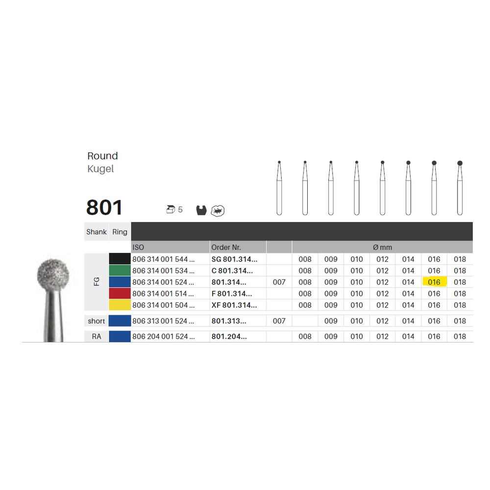 Diamantbor med flere diamantlag i den skærende del, så boret er mere holdbart, effektivt og stabilt. Med "Multilayer Diamond Instrument Guarantee" som er producentens garanti for et bor med en god skære-evne over længere tid. Til præparation, til FG, rund, medium med blå ring, hovedlængde 1,6 mm, 001/016 M (801).