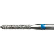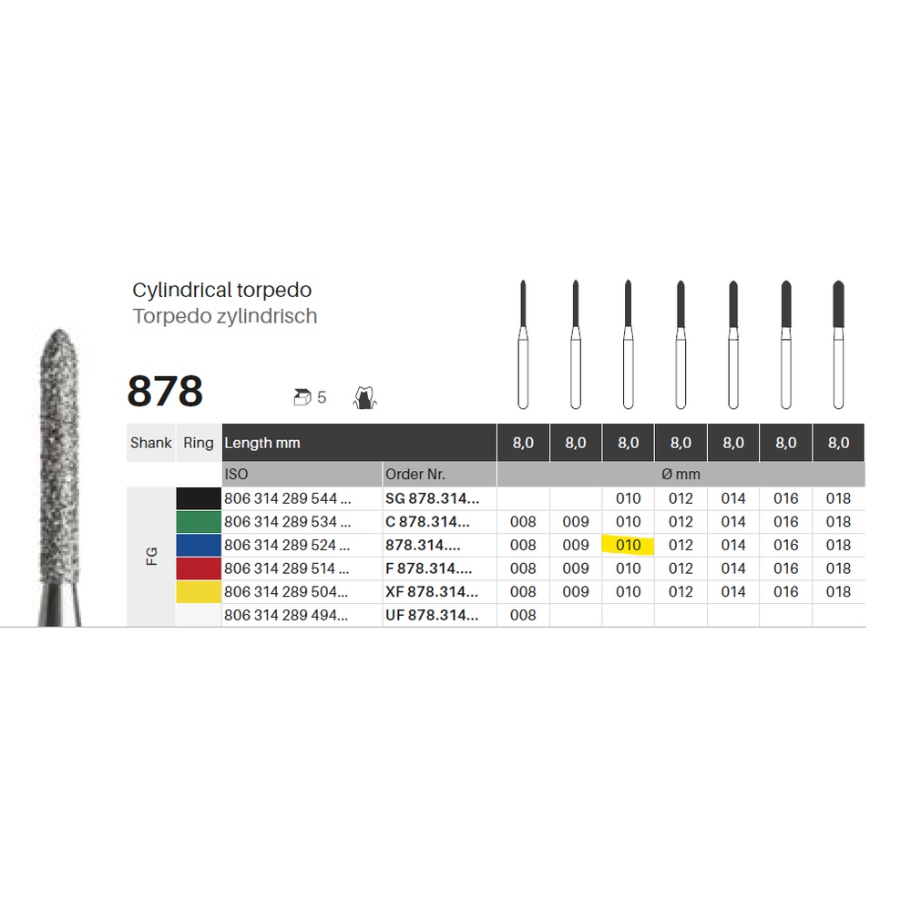 Diamantbor med flere diamantlag i den skærende del, så boret er mere holdbart, effektivt og stabilt. Med "Multilayer Diamond Instrument Guarantee" som er producentens garanti for et bor med en god skære-evne over længere tid. Til præparation, til FG, torpedoformet, medium med blå ring, hovedlængde 8 mm, 289/010 M (878).