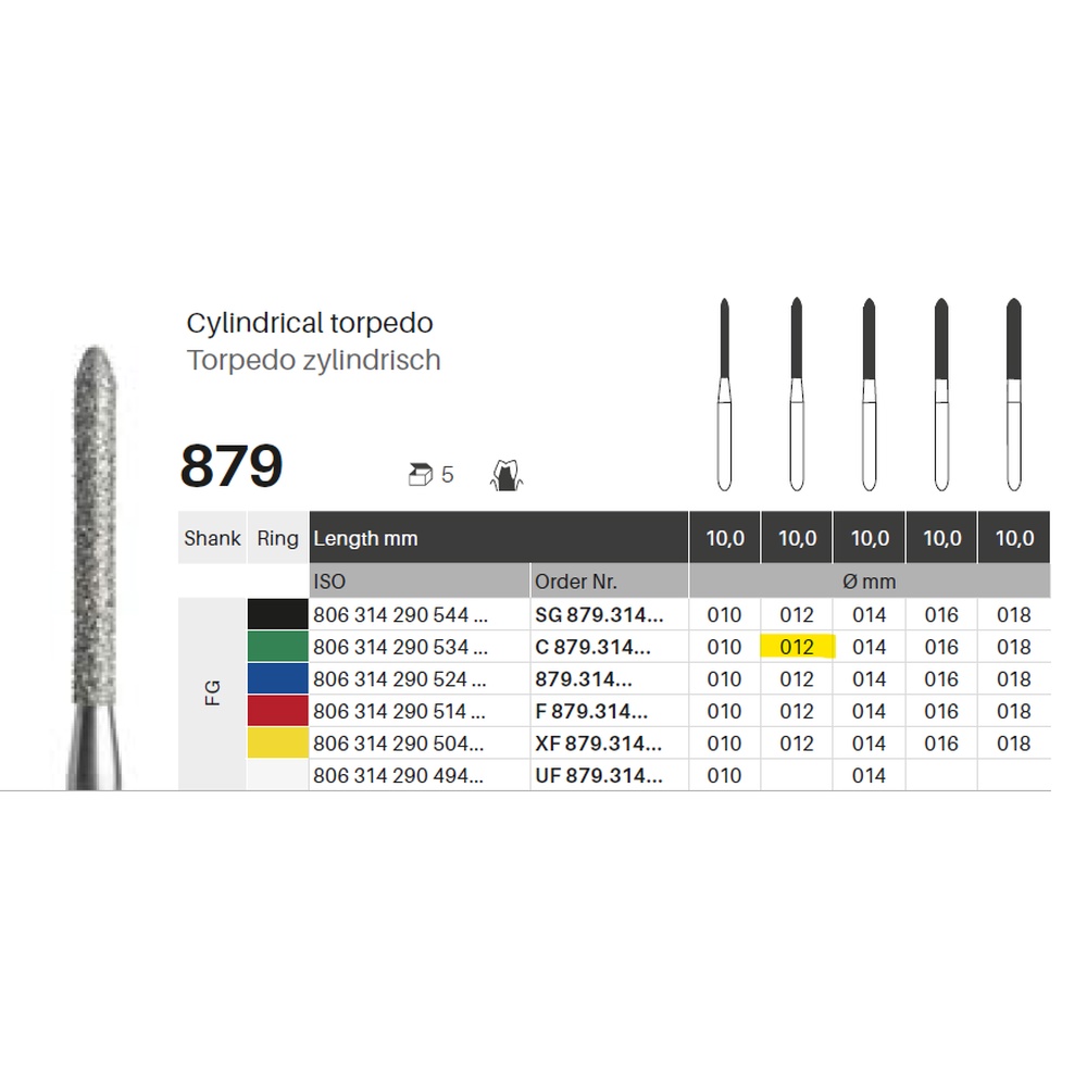 Diamantbor med flere diamantlag i den skærende del, så boret er mere holdbart, effektivt og stabilt. Med "Multilayer Diamond Instrument Guarantee" som er producentens garanti for et bor med en god skære-evne over længere tid. Til præparation, til FG, torpedoformet, grov med grøn ring, hovedlængde 10 mm, 290/012 C (879).