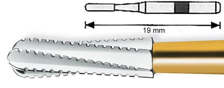 Særligt velegnet til skæring af broer og kroner, samt til fjernelse af amalgam eller komposit. Hårdmetal transmetal FG bor med ekstrafin rillet skær. Længde 19 mm, ISO 012.