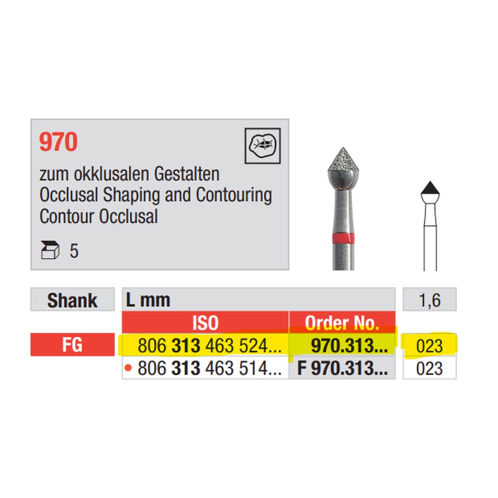 Diamantbor til FG, nr. 970 Raptor til okklusal konturering af fissursystem, str. 023. Medium