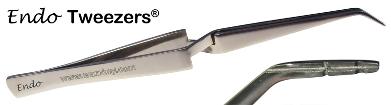 Endo pincet, rustfrit stål, med krydsgreb således at pincetten selv fastholder emnet. Med rille på langs og på tværs i næbbet til points, stifter etc.