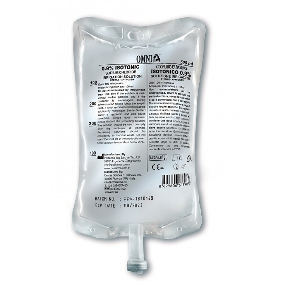 0,9% natriumklorid, sterilt saltvand, i ophængspose med gummi-membran ved åbningen.