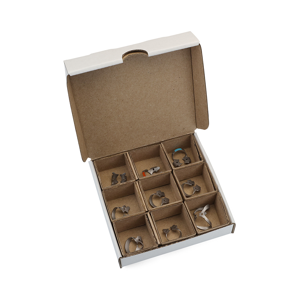 Sæt med 9 farvekodede kofferdamklammer.
