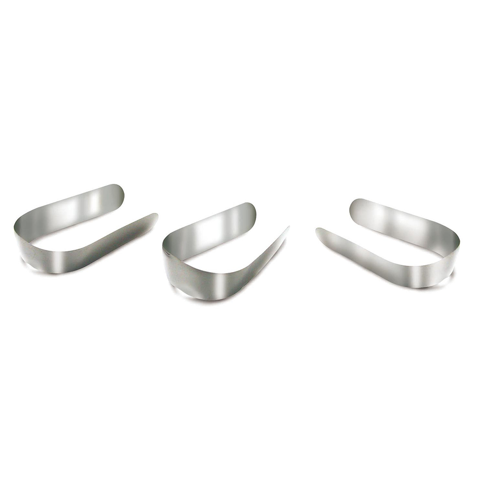 Molar uden bue. Tykkelse 0,04 mm. Højde 6,3 mm. Kontureret anatamisk formede og nemme at tilpasse. Blødt rustfrit stål.