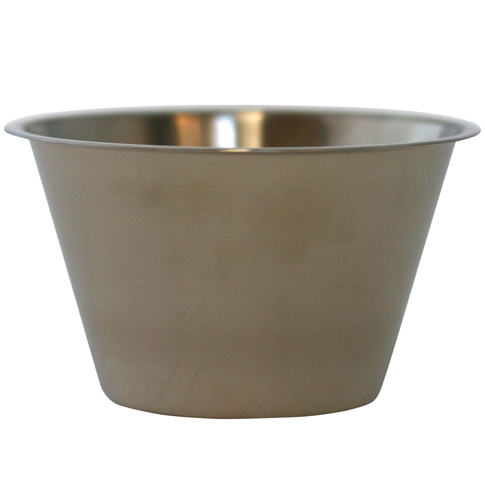 Bæger i rustfrit stål. 6 cm diameter i bunden, 6 cm høj. 300 ml.