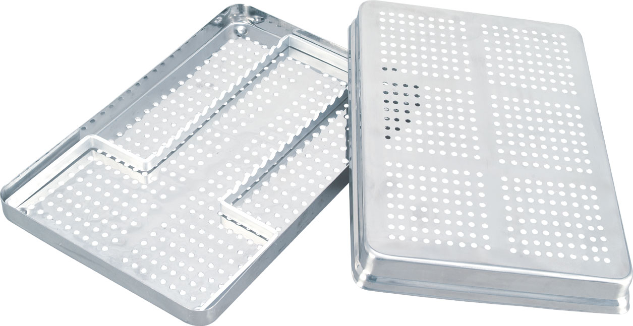 Perforeret rustfrit stål låg + perforeret rustfrit stål bund + instrumentholder i aluminium. Leveres uden instrumenter.