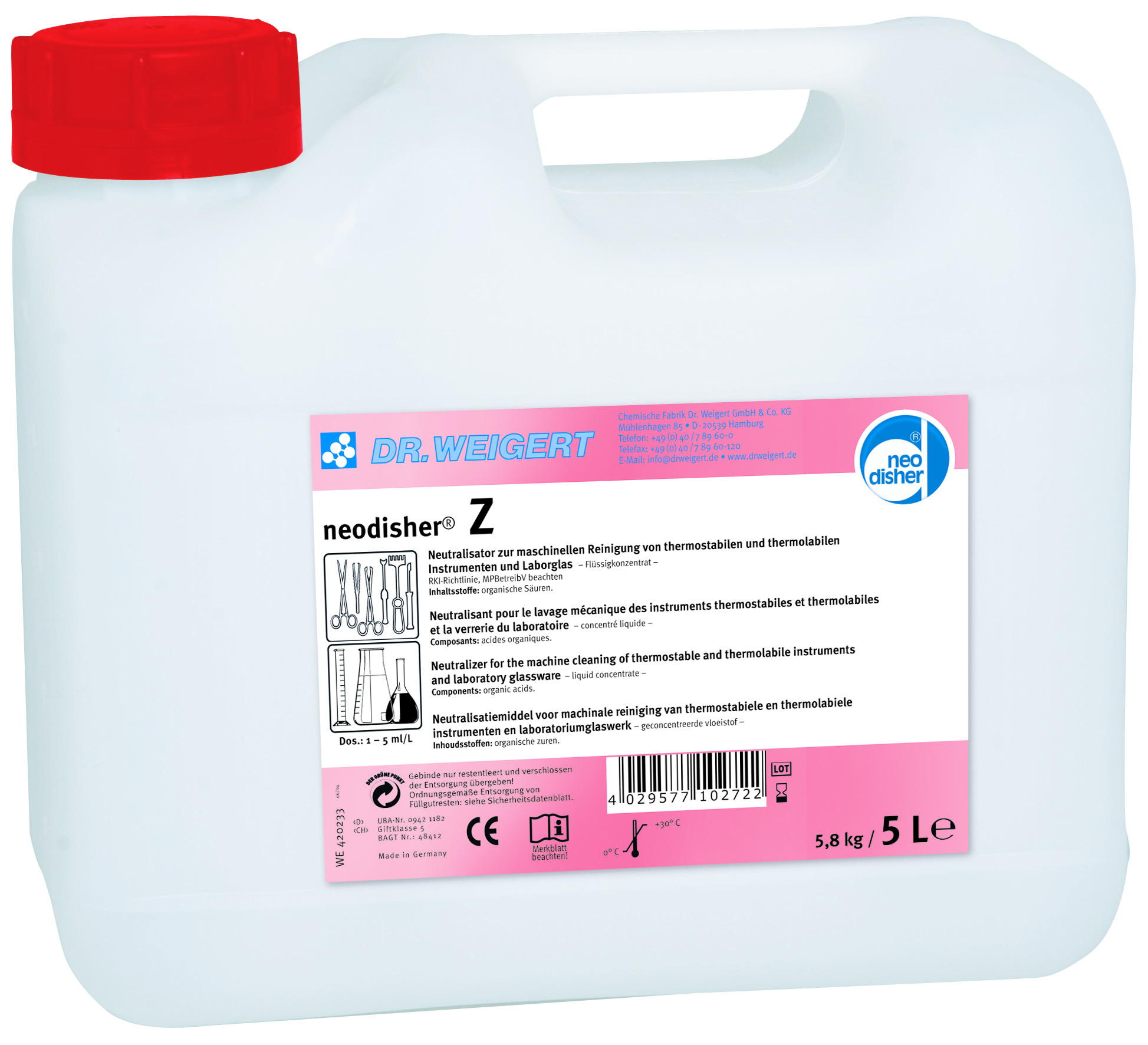 Flydende neutraliseringsmiddel, 5 L Til professionel brug i tandlægeklinikker. Neutraliserer sæberester, alkaliske rester og fjerner evt. oliehinder og giver en pæn finish på instrumenterne.