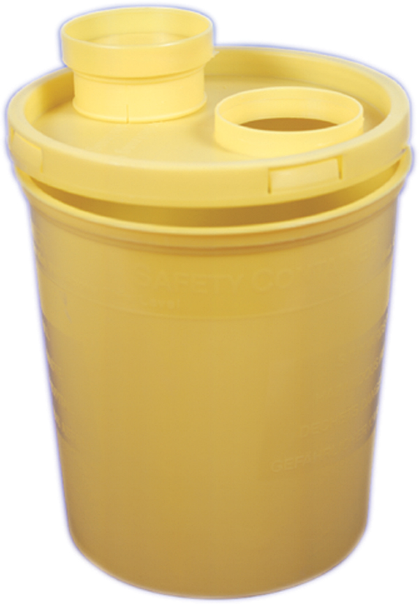 Beholder til skarpe og spidse genstande, rummer ca. 1,8 liter. Låget kan lukkes midlertidigt under brug og permanent inden aflevering. Gul, kraftig plast.