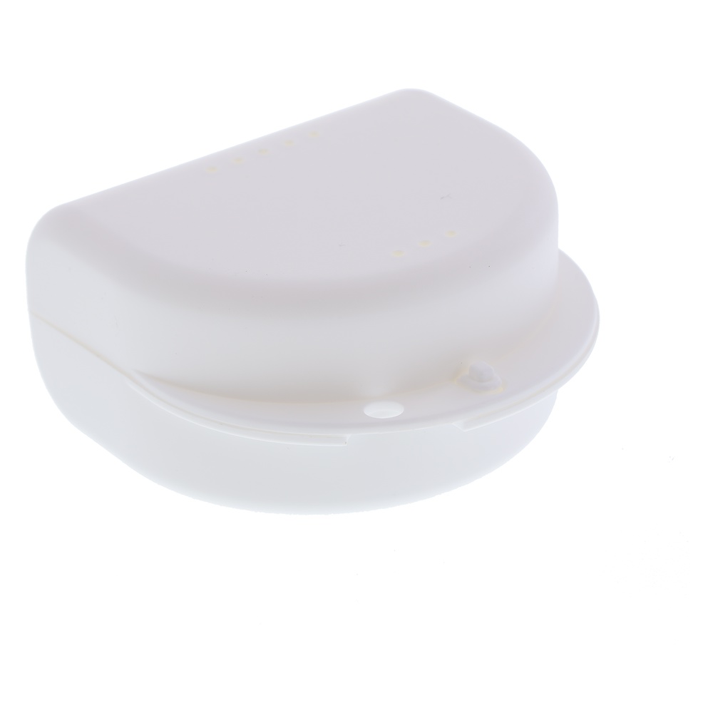 Plastæsker/opbevaringsæsker til bideskinner eller proteser, hvide, model Ortho, størrelse 8 x 8 cm, højde 4,3 cm. perforeret.