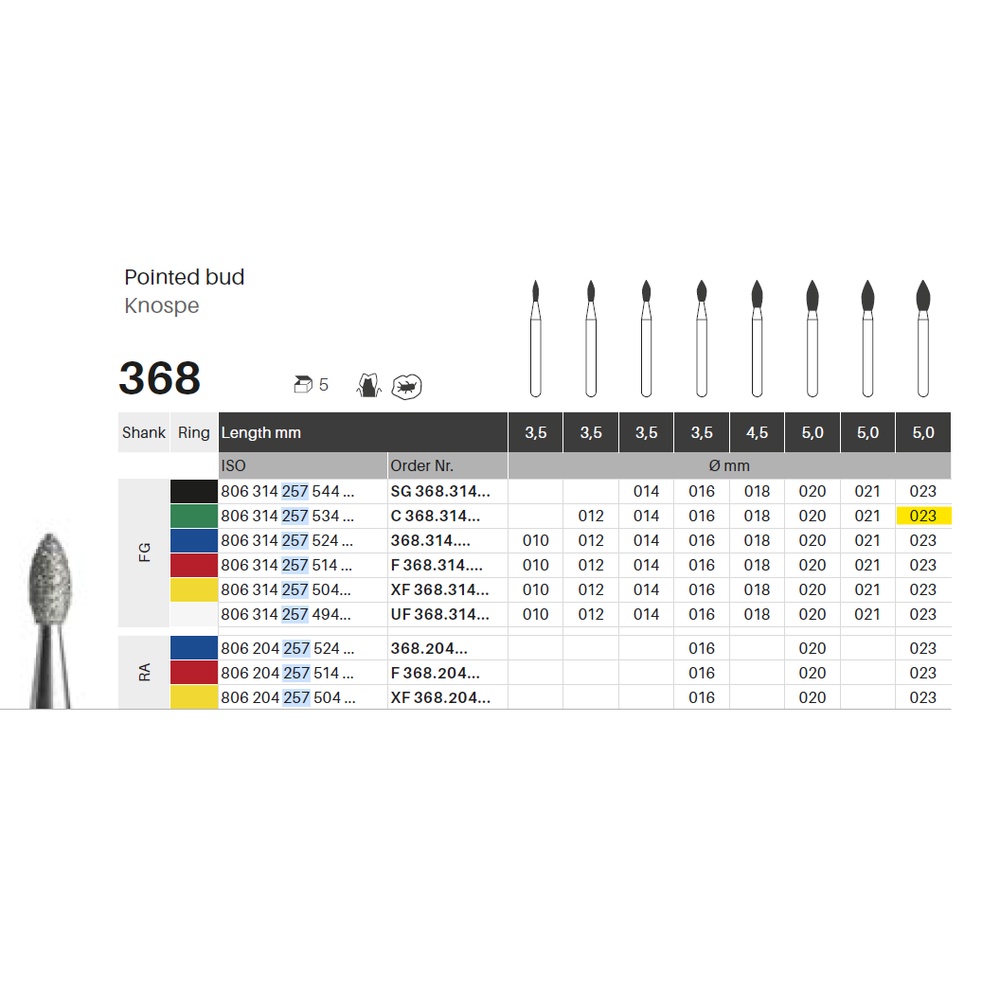 Diamantbor med flere diamantlag i den skærende del, så boret er mere holdbart, effektivt og stabilt. Med "Multilayer Diamond Instrument Guarantee" som er producentens garanti for et bor med en god skære-evne over længere tid. Til pudsning, til FG, knopformet, grov med grøn ring, hovedlængde 5 mm, 257/023 C (368).
