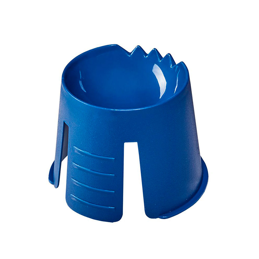 Dappenbæger, blå farve, polypropylen plast, takket kant og flige til fastsætning på bakkens kant.