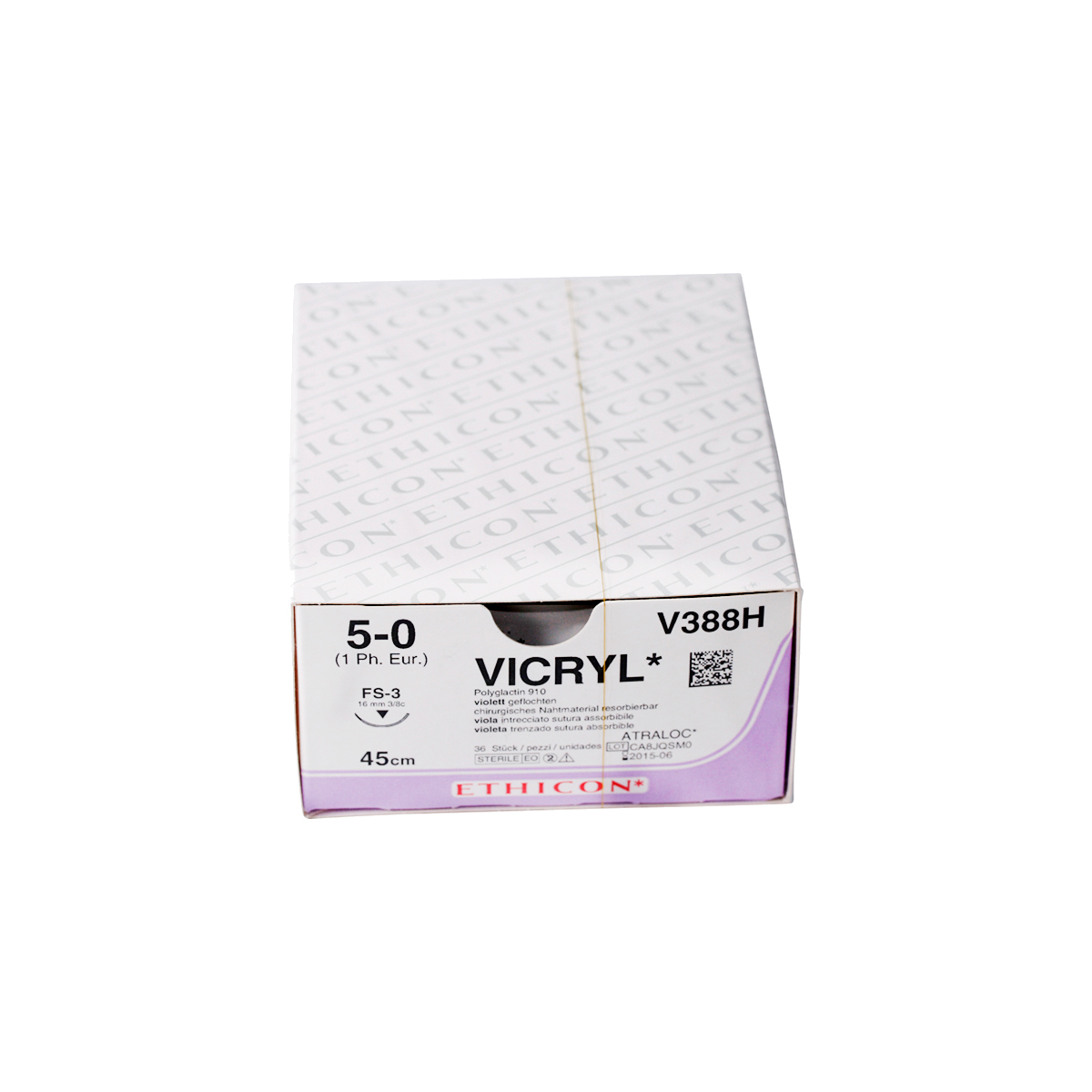 V388H. Sutur, vicryl resorberbar 0,15 mm, 5-0, 45 cm. Omv. skærende FS-3 nål.
