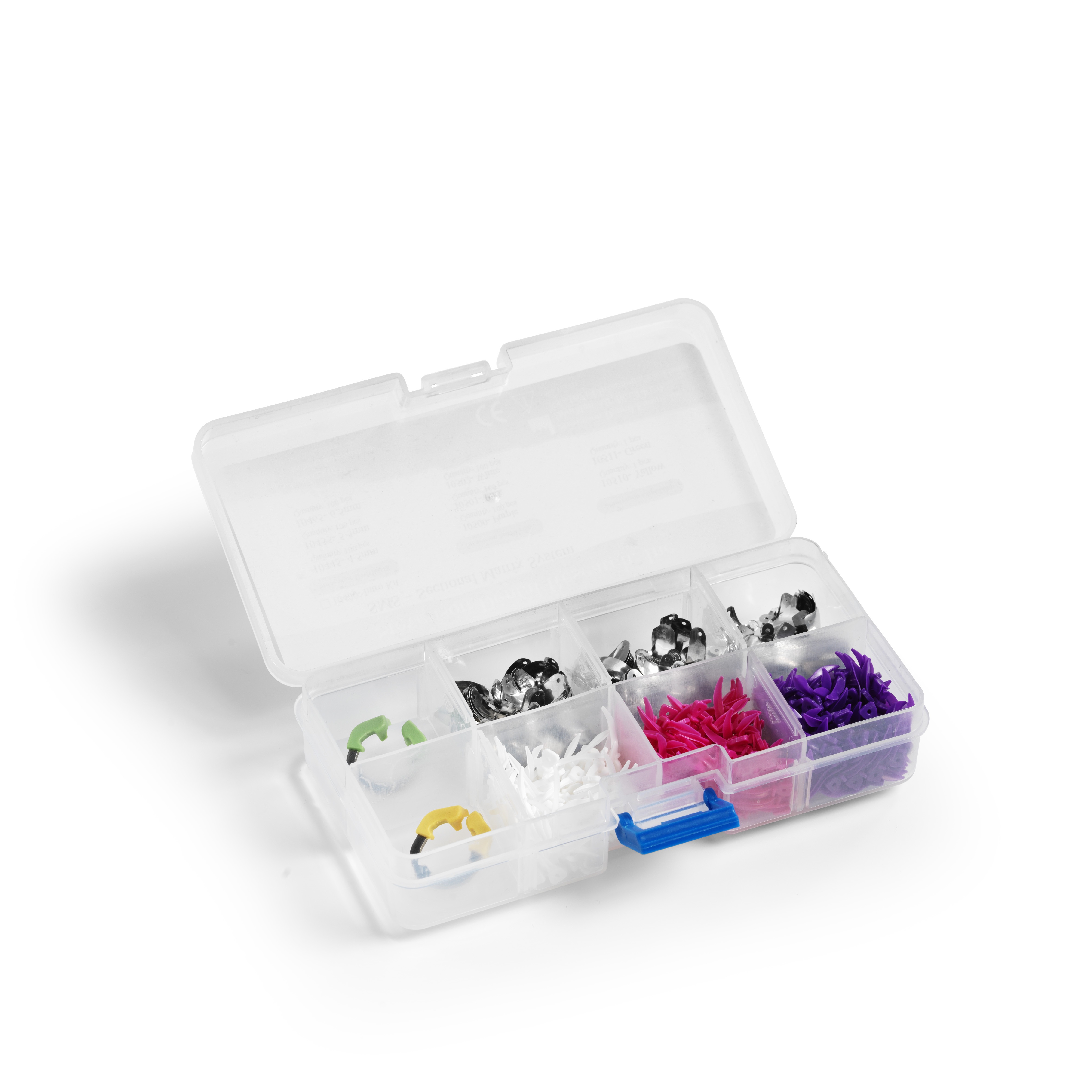 1 grøn universal ring, 1 gul smal ring, 3x100 stk. matricer ( 4,5 mm, 5,5 mm, 6,5 mm), 3x100 kiler ( hvid, pink lilla).