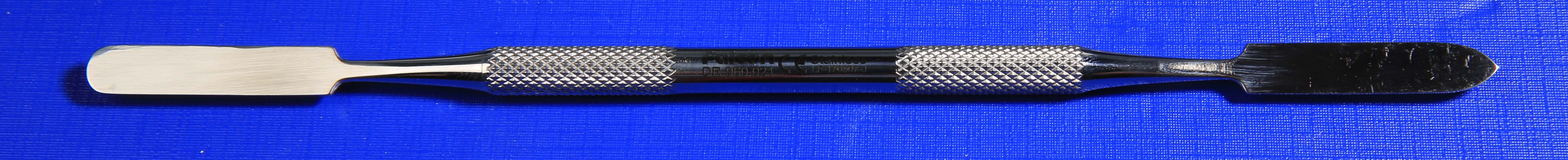 Rustrfrit stål cementspatel dobbeltendet med 6 mm bredt riflet håndgreb. Spatelbredde cirka 0,65 mm.
