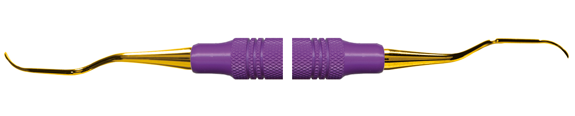 American Eagle Curette Barnhart med guldfarvede ender og lilla plastgreb. OBS: Må ikke slibes. .Til anteriort brug med smal arbejdende del og let vinklet hals. AECB1-2XPX