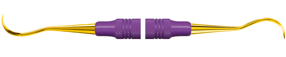 Scaler H6-7 med guldfarvede ender og lilla plastgreb. OBS: Må ikke slibes. Til anteriort brug, supertynd, kontravinklet, meget effektiv til interproximalt brug, halsens vinkling giver god adgang til alle fortænder samt præmolarer. AESH6-7XPX