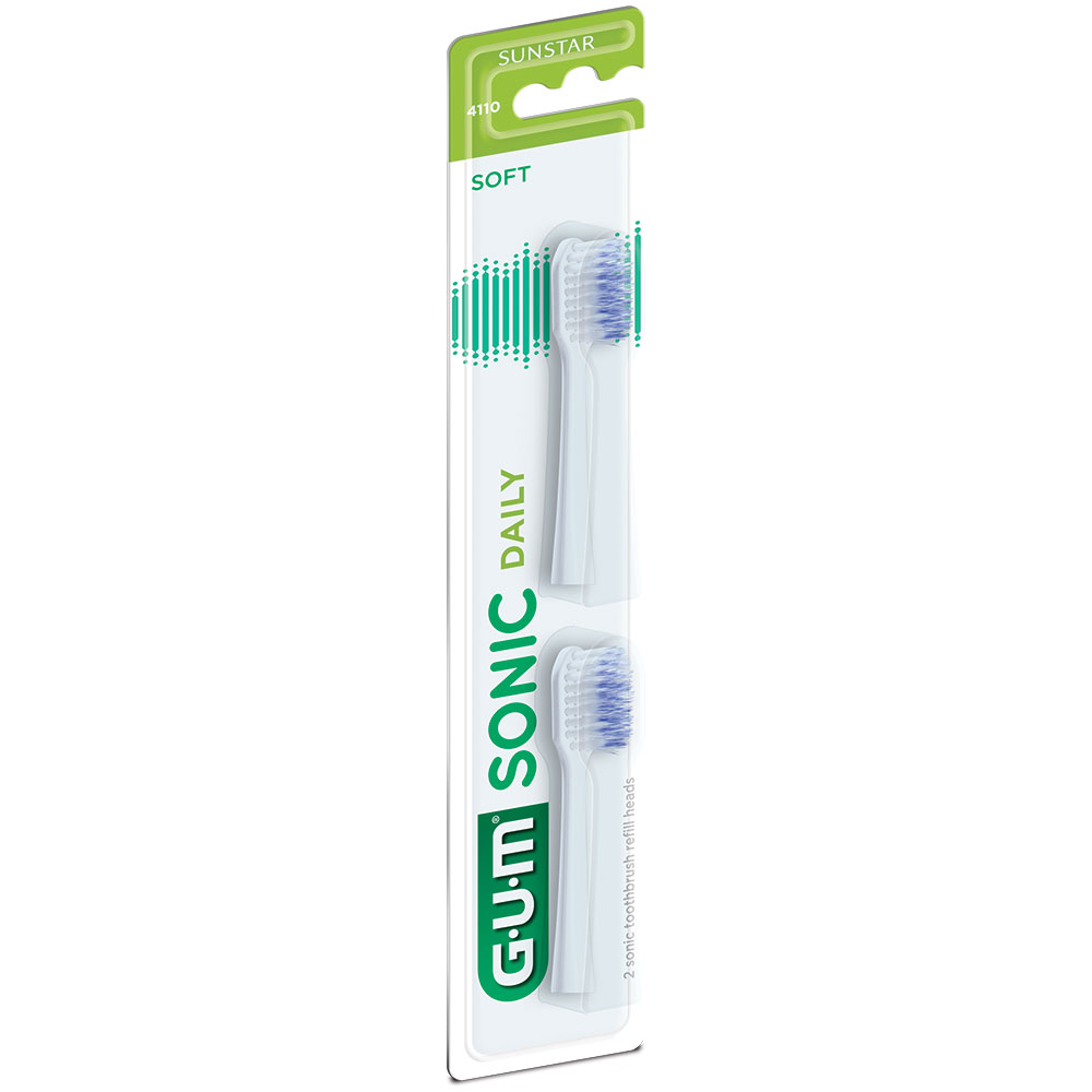 GUM Sonic Daily børstehoveder til batteritandbørste, soft i 2 stk. pakning. Hvid.