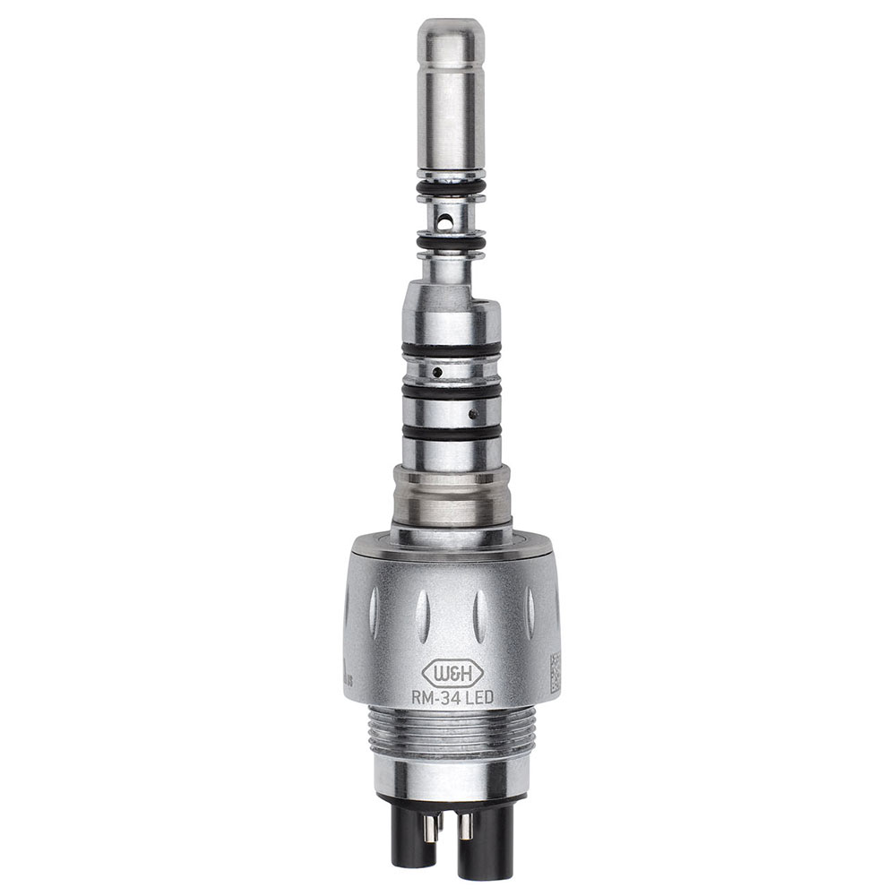 W&H-koblingen RM-34 LED til Multiflex ® forbindelse er et forbindelsesstykke til transmission af medier (luft, vand, elektricitet og lys) mellem dentalenhedens forsyningsslange og luftdrevene. W&H koblingen RM-34 LED er kompatibel med alle turbiner, luftmotorer og scalers med Roto Quick og Multiflex ® * tilslutning.